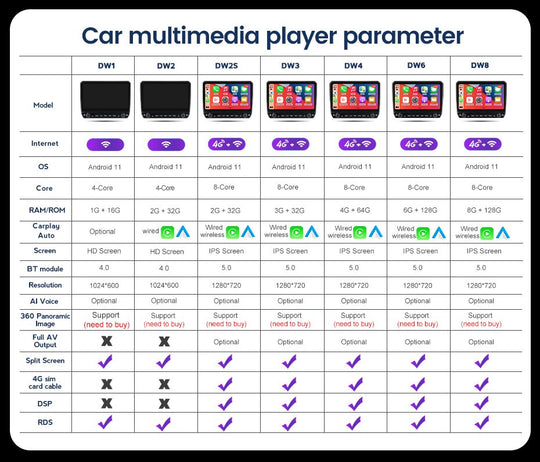 Product Paramenters OS Android 11 Android 11 Android 11 CPU 4-core ARM Coretex TM -A7, 1.3GH Quad core 8227L A7 4*1.3 Octa CoreCA75X2/2GHZ CA55X6/1.8GHZ RAM 1G 2G 2G/4G8G ROM 16G 16G/32G 32G/64G/128G Internet Built-in WIFI...Regular price From $280.00 -