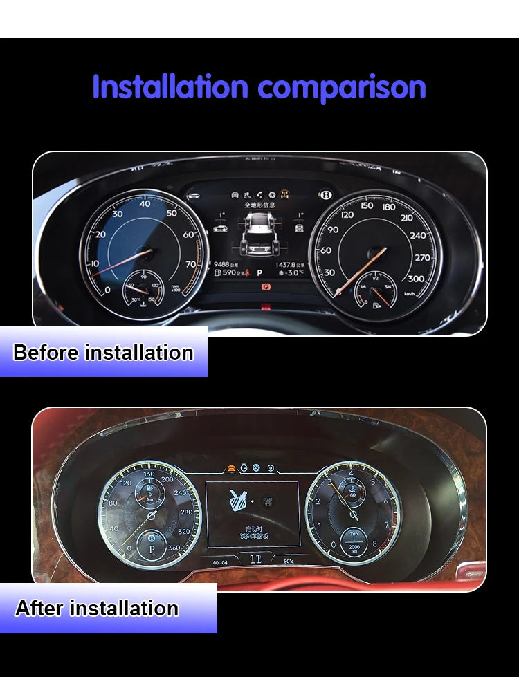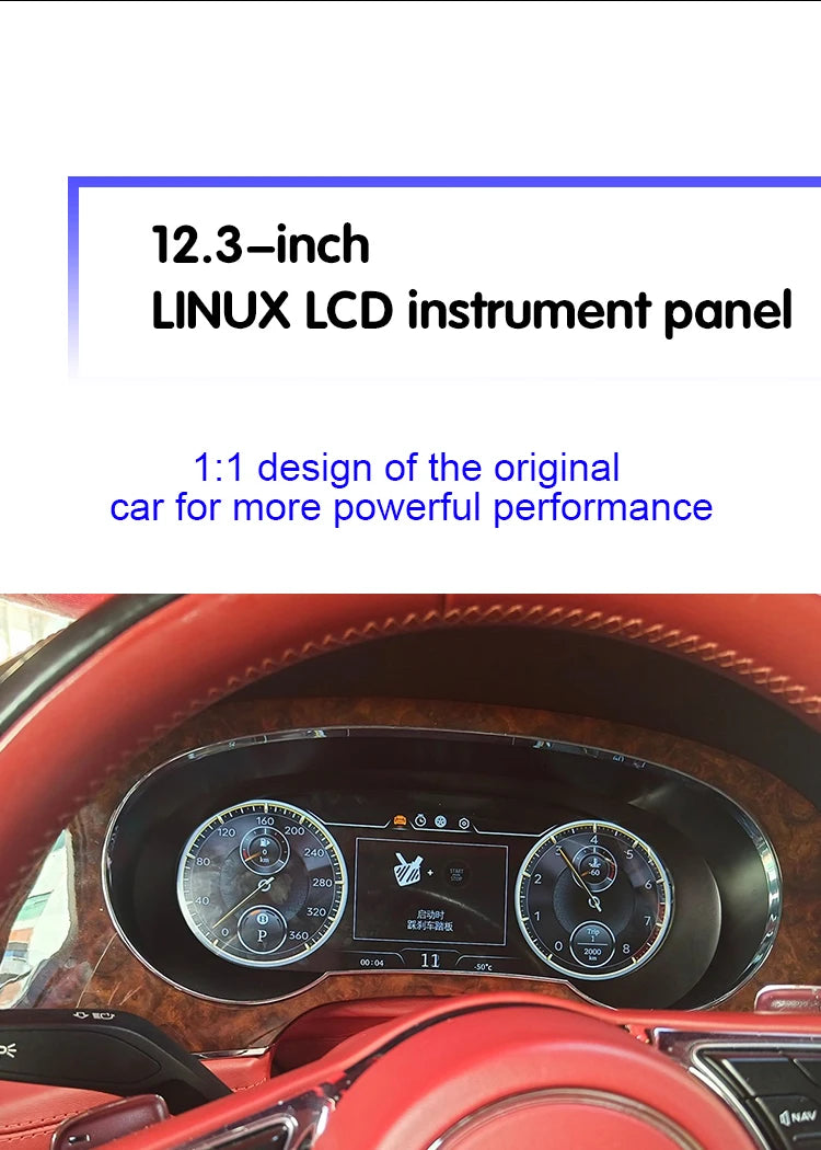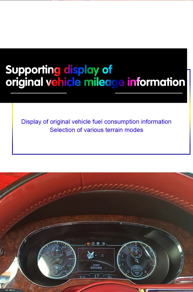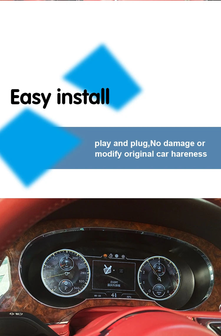 Key features for Bentley Bentayga 2016-2019 digital cluster cockpits 1.Linux operation system, stable and fast, start up in less than 2 seconds. 2.Keep original car functions 3.Steering Wheel Control Support 4.12.3inch, 1920*720 HD IPS screen, 320dpi, 1000cd/m2, very clear and bright. 5. Plug and play.No need to cut or Code anything.Easy Install 6.Funtions: support orginal tire,oil/water tempreture,oil pressure,fule consumption,car body balance and so on 7.Driving models:(Classical, Sport, Avantgarde mode) 8.OSD Language: English / Russian / French / German / Spanish / Italian / Arabic / Portuguese / Turkish / Thai / Polish / Hebrew all 53 Languages   Car Fitment:   Fit For Bentley Bentayga 2016-2019 Important Note: please check your original car dashboard and appearance before make a order bid to avoid mistake,if you don't know this unit fit your car or not,send message to us,we will help you.