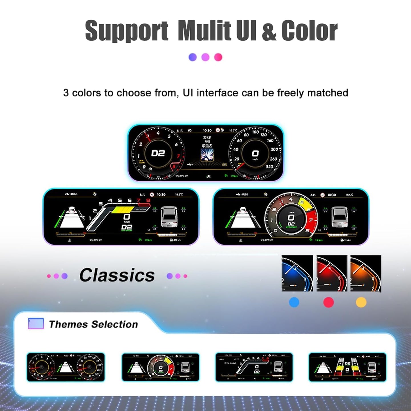 - 【12.3-inch HD LCD Screen】The 12.3-inch HD display with a screen resolution of 1920x720 offers a top-notch visual experience. With various user interface styles such as classic, sporty and offroad.