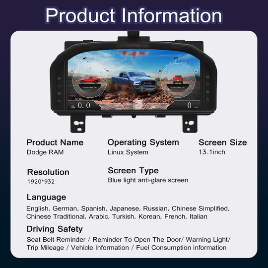 【Applicable Vehicle】 This LCD Speedometer Virtual Cockpit is for Dodge RAM 1500/2500/3500 2012-2018. 【Function Parameters】support orginal Miles/KM/Tyre Presure/Oil/water tempreture,oil pressure,fule,etc. 【Linux OS】 CPU:T5 1.5Ghz,Linux operation system . 【Driving models】Customize the theme and UI. 【Current and voltage...Regular price $799.00 -