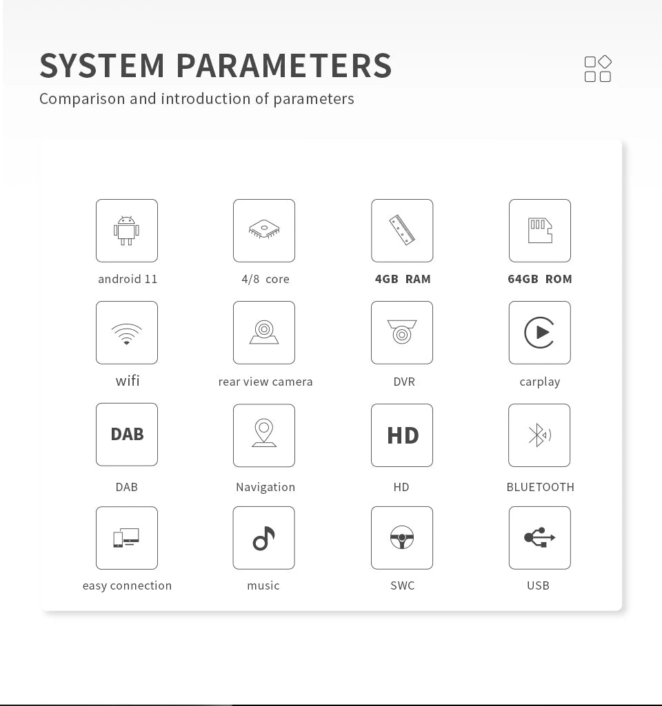 2.CPU: Android 11 64 Bit Quad-core ARM A7 4*1.8 GHz