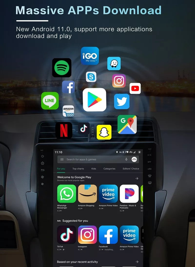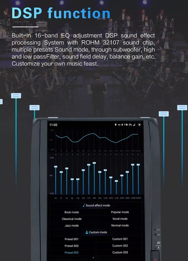 12.1 inch Android 11.0 HD digital touch screen 1. Android 11.0 operating system 2. Support 1080P+ support lossless music 3. Support steering wheel control (if your car has it) 4. Support Phone Link (AirPlay, Miracast) 5. Output: 4x50W max Power output/5.1 channel lossless audio output 6.Audio Frequency: 7 EQ balanced audio processing technology 7.OSD language: English/Russian/French/German/Spanish/Italian/Arabic/Portuguese/Turkish/Thai/ More than 20 languages such as Polish/Hebrew 8. Automatically display rear view camera image when reversing 9. Support media card/GPS card/USB memory stick up to 32GB SD card and 1T hard disk 10. Audio model: Classic/Rock/ Pop/Hall Cinema 11. Music spectrum: display music spectrum when playing audio 12. Audio format: MP3/ WMA/ FLAC/ APE/ ACC etc. 13. Picture format: JPG/ BMP/ GIF/ PNG etc. 14. Video format: H264/ MP4/ AVI/ RMVB/ FLV/ MKV/ MOV, etc. 15.WiFi: Built-in WiFi and antenna 16.Car Door Info: Display the status of the door switch (the original car has this function) 17.Rotating Speed: Display the speed on the screen 18. Running Speed: Display the running speed or engine on the screen 19. Rear view camera: For cars without original camera 20. Support the latest phonebook search, you can search and find contacts in the downloaded phonebook, just enter the name The first letter, you will find some related names, then you can choose the suitable one 21.Radio Tuner with RDS, 30 Preset Radio Stations (FM: 3*6, AM: 2*6) 22.USB port and Micro SD slot, support USB stick and memory card up to 32GB 23.Parking Sensor: Suitable for cars without original parking sensor 24.TPMS: USB TPMS for Android car GPS 25.Support steering wheel control function Support steering wheel control function