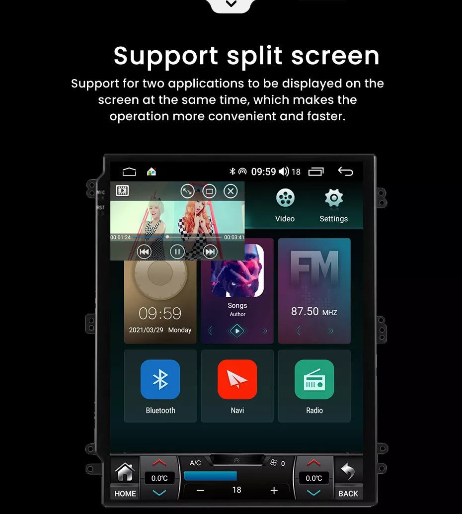 9/10 inch Android 11.0 HD digital touch screen 1. Android 11.0 operating system 2. Support 1080P+ support lossless music 3. Support steering wheel control (if your car has it) 4. Support Phone Link (AirPlay, Miracast) 5. Output: 4x50W max Power output/5.1 channel lossless audio output 6.Audio Frequency: 7 EQ balanced audio processing technology 7.OSD language: English/Russian/French/German/Spanish/Italian/Arabic/Portuguese/Turkish/Thai/ More than 20 languages such as Polish/Hebrew 8. Automatically display rear view camera image when reversing 9. Support media card/GPS card/USB memory stick up to 32GB SD card and 1T hard disk 10. Audio model: Classic/Rock/ Pop/Hall Cinema 11. Music spectrum: display music spectrum when playing audio 12. Audio format: MP3/ WMA/ FLAC/ APE/ ACC etc. 13. Picture format: JPG/ BMP/ GIF/ PNG etc. 14. Video format: H264/ MP4/ AVI/ RMVB/ FLV/ MKV/ MOV, etc. 15.WiFi: Built-in WiFi and antenna 16.Car Door Info: Display the status of the door switch (the original car has this function) 17.Rotating Speed: Display the speed on the screen 18. Running Speed: Display the running speed or engine on the screen 19. Rear view camera: For cars without original camera 20. Support the latest phonebook search, you can search and find contacts in the downloaded phonebook, just enter the name The first letter, you will find some related names, then you can choose the suitable one 21.Radio Tuner with RDS, 30 Preset Radio Stations (FM: 3*6, AM: 2*6) 22.USB port and Micro SD slot, support USB stick and memory card up to 32GB 23.Parking Sensor: Suitable for cars without original parking sensor 24.TPMS: USB TPMS for Android car GPS 25.Support steering wheel control function Support steering wheel control function