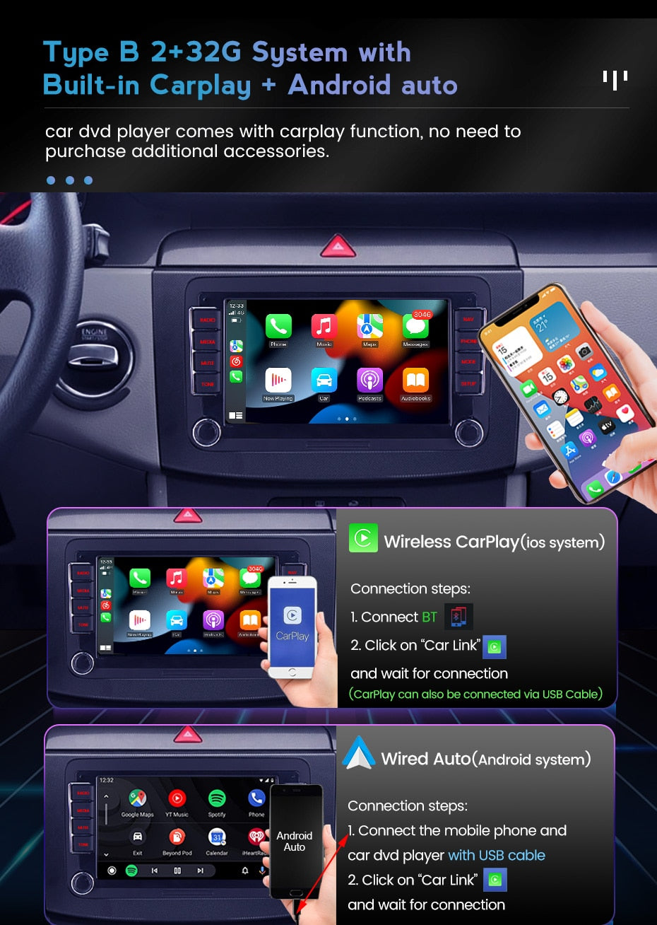 >Built-in Carplay and Android Auto function . ( Only B 2+32G) > Phone| Music | Maps| Podcasts etc.. > Built-in Wireless + wired Carplay and wired Android Auto function. You can connect the phone with Android screen together, control and handle mobiles via device, open your safe driving life.