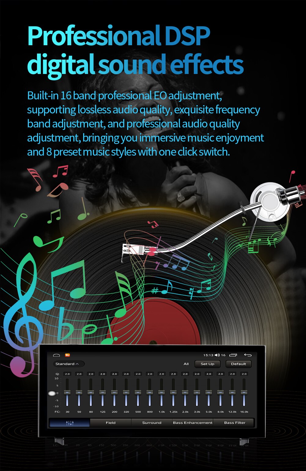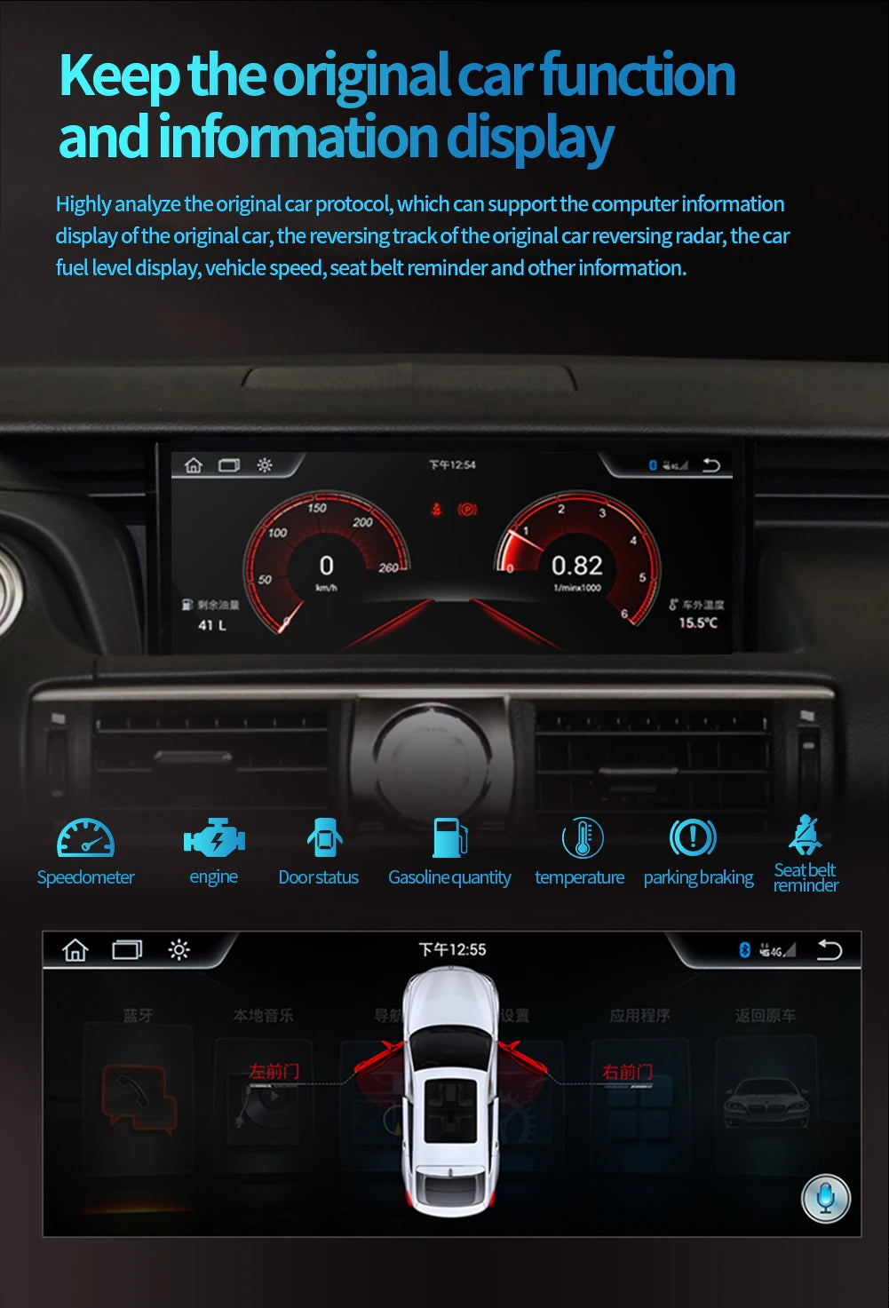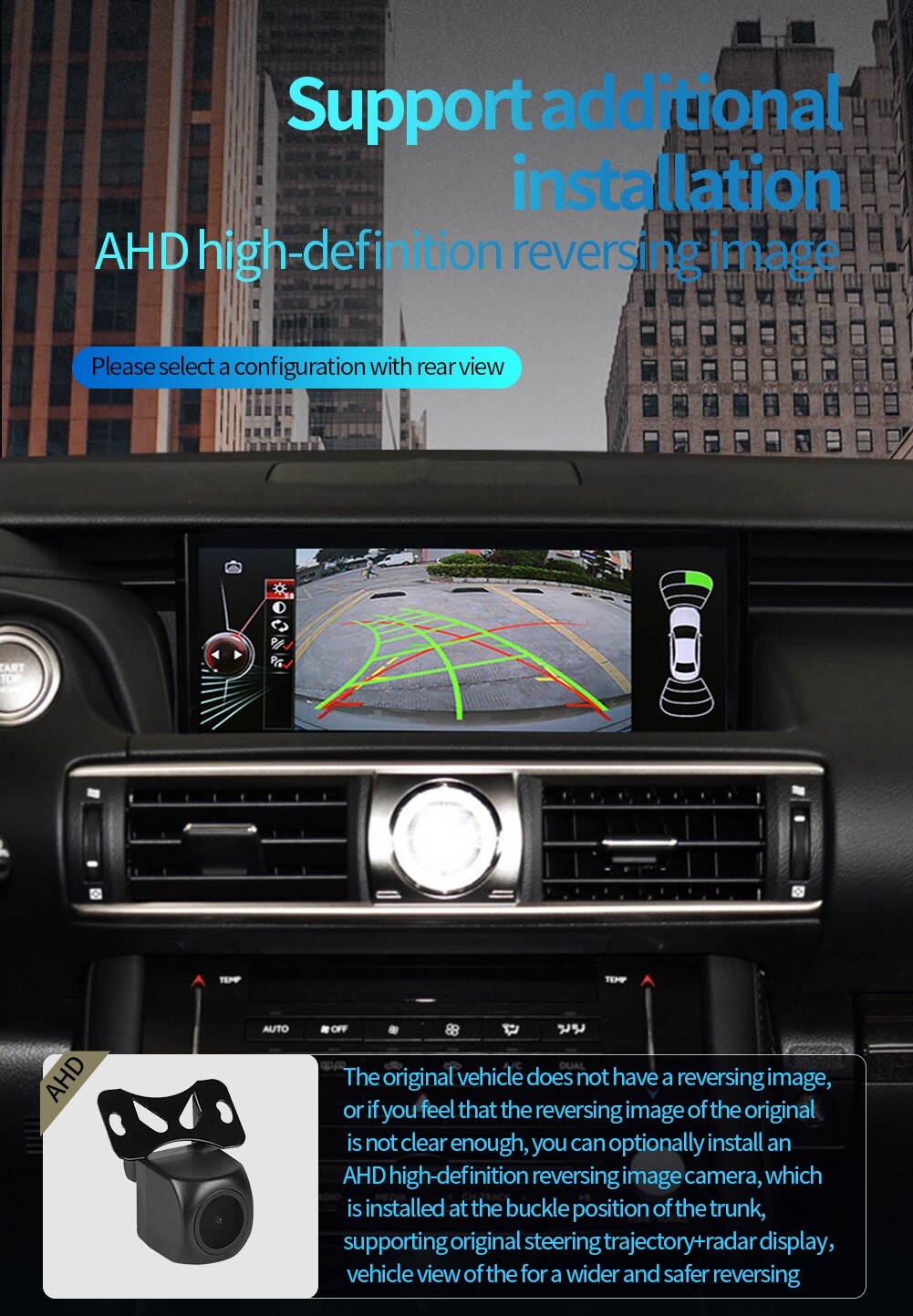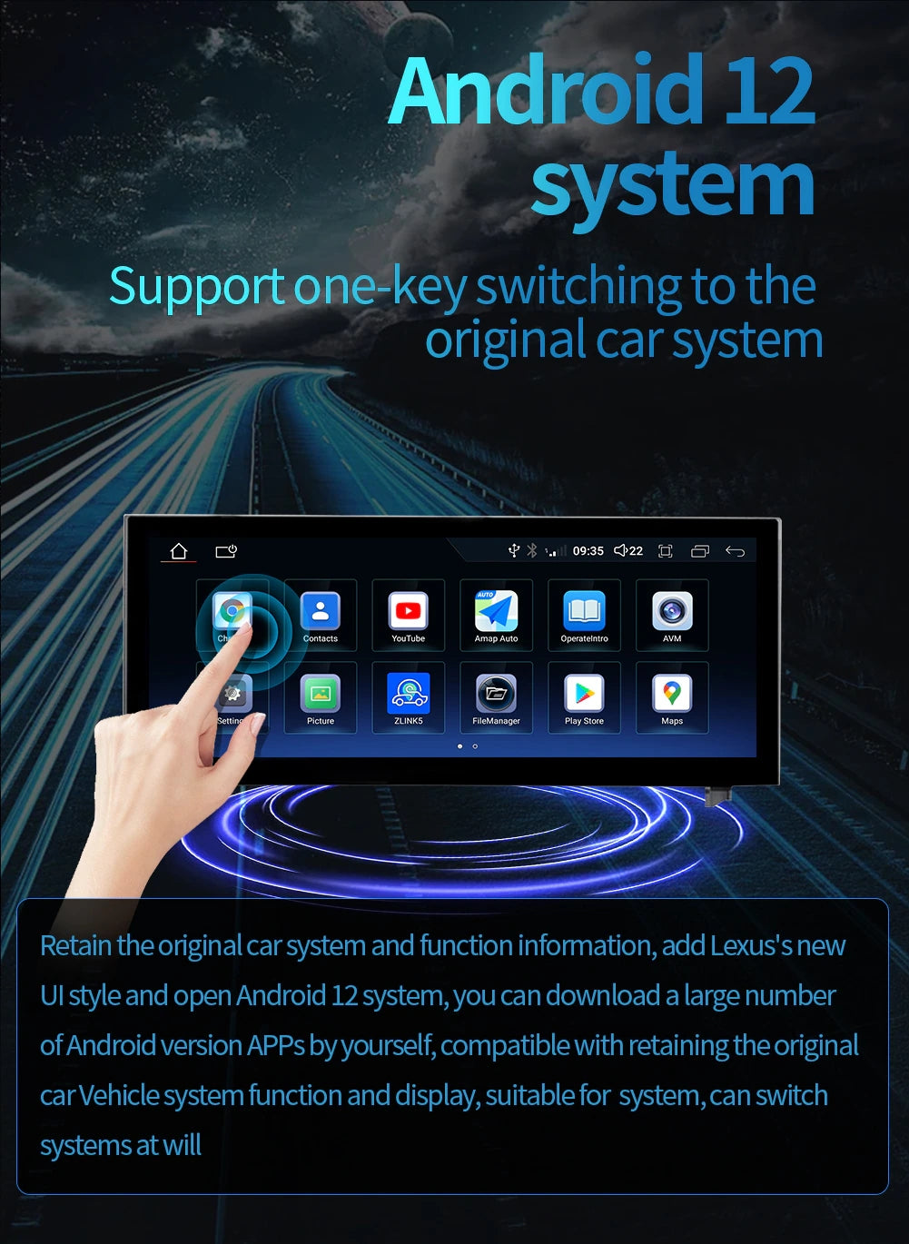 12.3 inch Android 11.0 HD digital touch screen 1. Android 11.0 operating system 2. Support 1080P+ support lossless music 3. Support steering wheel control (if your car has it) 4. Support Phone Link (AirPlay, Miracast) 5. Output: 4x50W max Power output/5.1 channel lossless audio output 6.Audio Frequency: 7 EQ balanced audio processing technology 7.OSD language: English/Russian/French/German/Spanish/Italian/Arabic/Portuguese/Turkish/Thai/ More than 20 languages such as Polish/Hebrew 8. Automatically display rear view camera image when reversing 9. Support media card/GPS card/USB memory stick up to 32GB SD card and 1T hard disk 10. Audio model: Classic/Rock/ Pop/Hall Cinema 11. Music spectrum: display music spectrum when playing audio 12. Audio format: MP3/ WMA/ FLAC/ APE/ ACC etc. 13. Picture format: JPG/ BMP/ GIF/ PNG etc. 14. Video format: H264/ MP4/ AVI/ RMVB/ FLV/ MKV/ MOV, etc. 15.WiFi: Built-in WiFi and antenna 16.Car Door Info: Display the status of the door switch (the original car has this function) 17.Rotating Speed: Display the speed on the screen 18. Running Speed: Display the running speed or engine on the screen 19. Rear view camera: For cars without original camera 20. Support the latest phonebook search, you can search and find contacts in the downloaded phonebook, just enter the name The first letter, you will find some related names, then you can choose the suitable one 21.Radio Tuner with RDS, 30 Preset Radio Stations (FM: 3*6, AM: 2*6) 22.USB port and Micro SD slot, support USB stick and memory card up to 32GB 23.Parking Sensor: Suitable for cars without original parking sensor 24.TPMS: USB TPMS for Android car GPS 25.Support steering wheel control function Support steering wheel control function