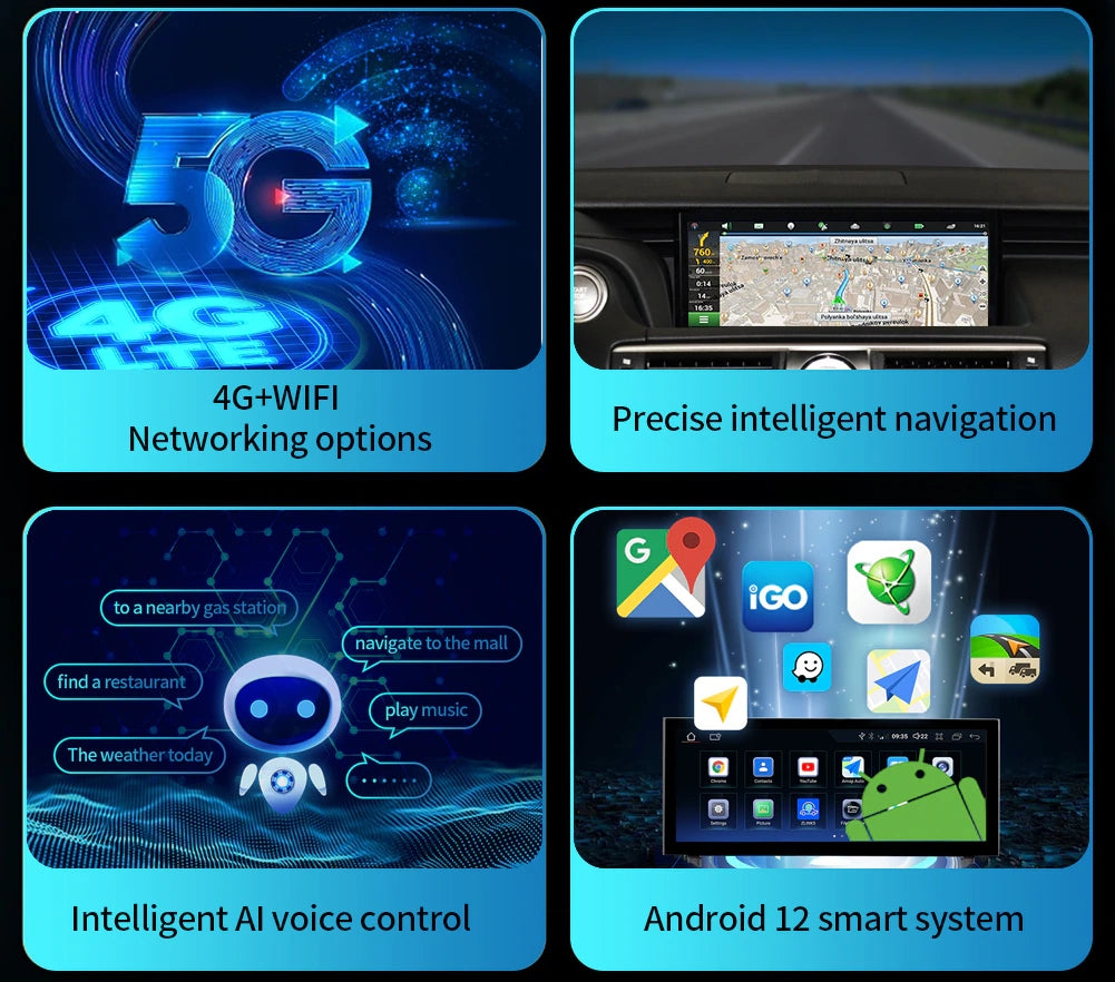 Main features: Operating system: Android10.0 Screen size: 12.3 inch high-definition digital screen Screen resolution 1024*600 Memory: 1GB+ 16GB/2GB+ 32GB/4GB+64GB (optional) Processor: 4-core/8-core output power : 4x50W FM Frequency Range: 87.5-108 MHz, 18 radio stations can be preset GPS Navigation: Google Maps Online...