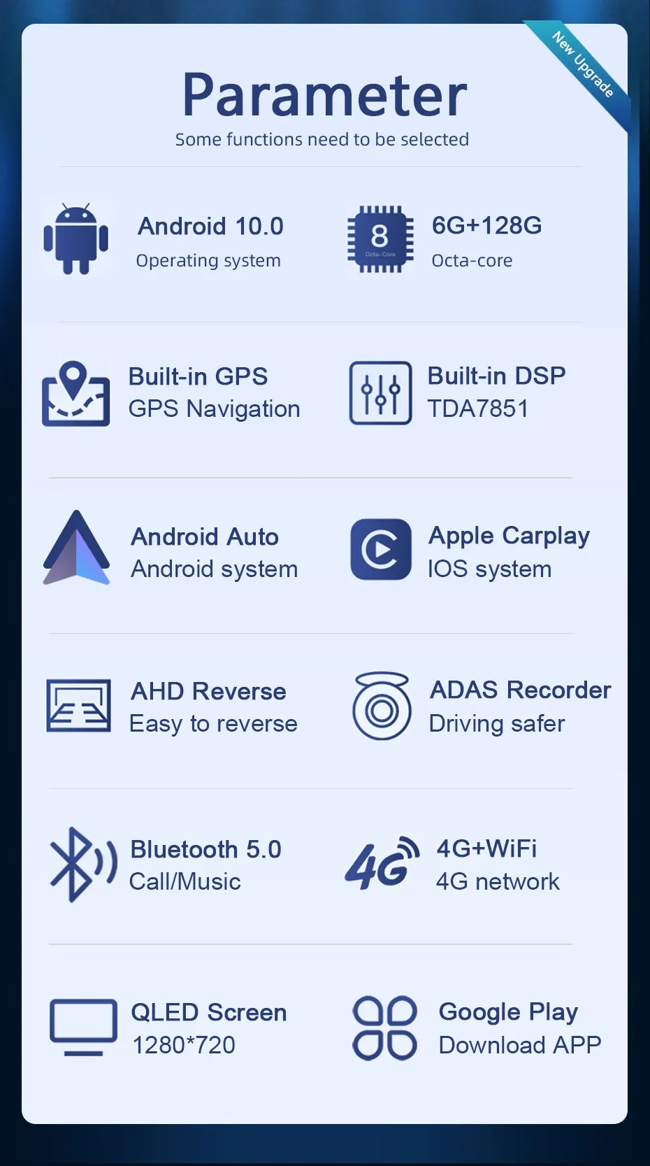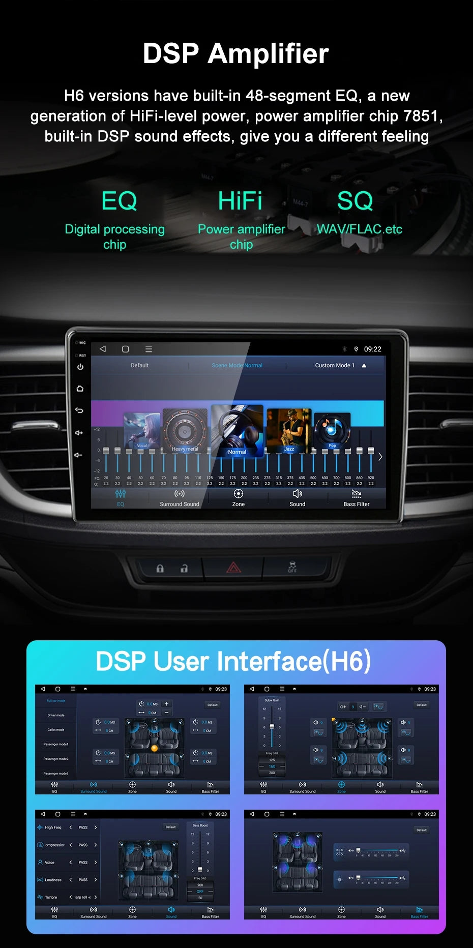9/10 inch Android 11.0 HD digital touch screen 1. Android 11.0 operating system 2. Support 1080P+ support lossless music 3. Support steering wheel control (if your car has it) 4. Support Phone Link (AirPlay, Miracast) 5. Output: 4x50W max Power output/5.1 channel lossless audio output 6.Audio Frequency: 7 EQ balanced audio processing technology 7.OSD language: English/Russian/French/German/Spanish/Italian/Arabic/Portuguese/Turkish/Thai/ More than 20 languages such as Polish/Hebrew 8. Automatically display rear view camera image when reversing 9. Support media card/GPS card/USB memory stick up to 32GB SD card and 1T hard disk 10. Audio model: Classic/Rock/ Pop/Hall Cinema 11. Music spectrum: display music spectrum when playing audio 12. Audio format: MP3/ WMA/ FLAC/ APE/ ACC etc. 13. Picture format: JPG/ BMP/ GIF/ PNG etc. 14. Video format: H264/ MP4/ AVI/ RMVB/ FLV/ MKV/ MOV, etc. 15.WiFi: Built-in WiFi and antenna 16.Car Door Info: Display the status of the door switch (the original car has this function) 17.Rotating Speed: Display the speed on the screen 18. Running Speed: Display the running speed or engine on the screen 19. Rear view camera: For cars without original camera 20. Support the latest phonebook search, you can search and find contacts in the downloaded phonebook, just enter the name The first letter, you will find some related names, then you can choose the suitable one 21.Radio Tuner with RDS, 30 Preset Radio Stations (FM: 3*6, AM: 2*6) 22.USB port and Micro SD slot, support USB stick and memory card up to 32GB 23.Parking Sensor: Suitable for cars without original parking sensor 24.TPMS: USB TPMS for Android car GPS 25.Support steering wheel control function Support steering wheel control function