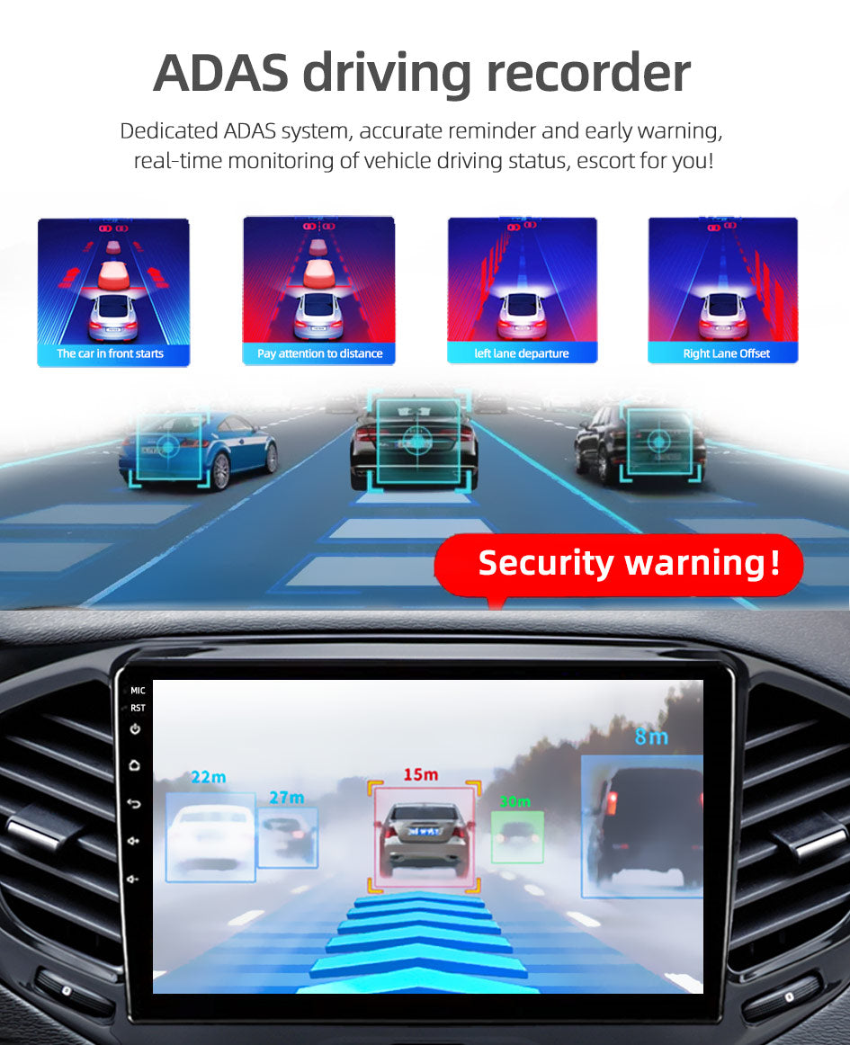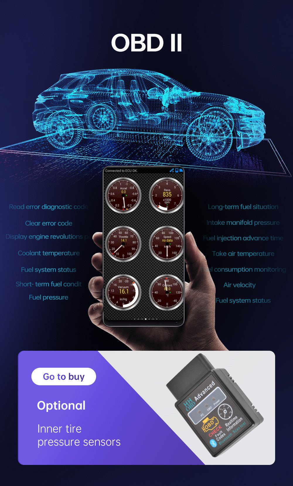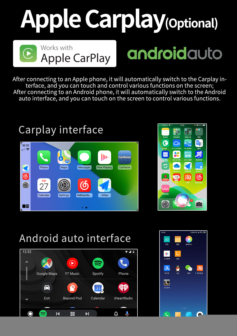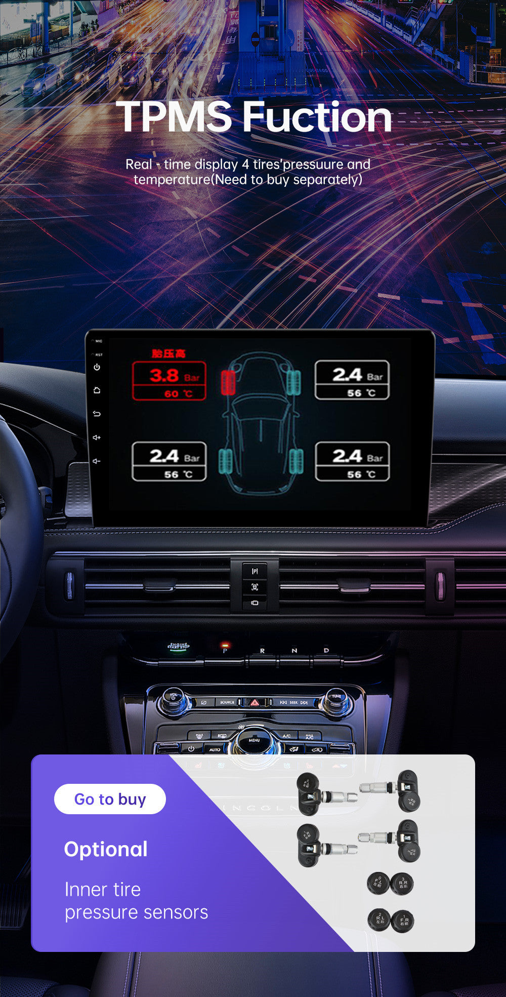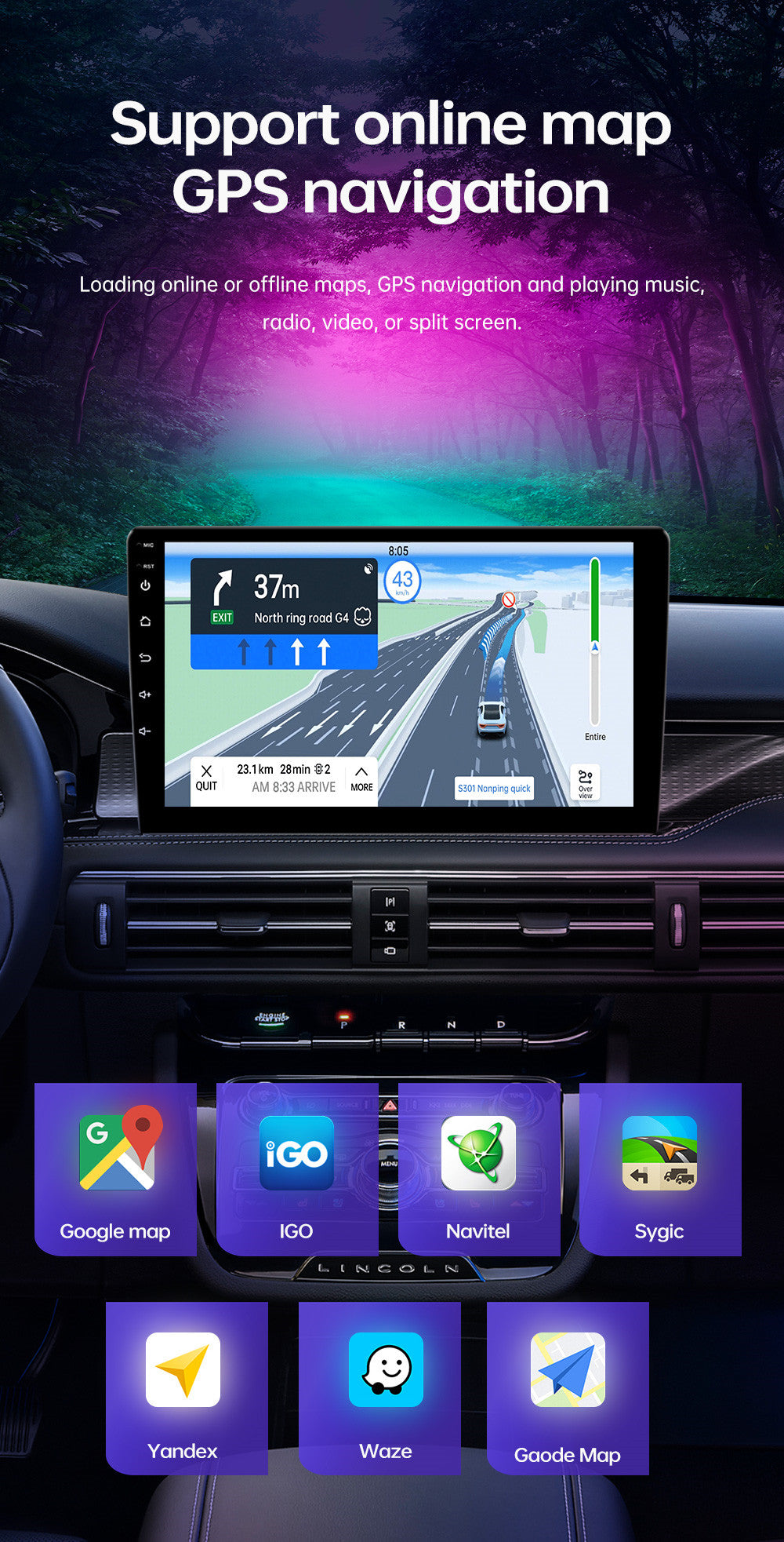 9/10 inch Android 11.0 HD digital touch screen 1. Android 11.0 operating system 2. Support 1080P+ support lossless music 3. Support steering wheel control (if your car has it) 4. Support Phone Link (AirPlay, Miracast) 5. Output: 4x50W max Power output/5.1 channel lossless audio output 6.Audio Frequency: 7 EQ balanced audio processing technology 7.OSD language: English/Russian/French/German/Spanish/Italian/Arabic/Portuguese/Turkish/Thai/ More than 20 languages such as Polish/Hebrew 8. Automatically display rear view camera image when reversing 9. Support media card/GPS card/USB memory stick up to 32GB SD card and 1T hard disk 10. Audio model: Classic/Rock/ Pop/Hall Cinema 11. Music spectrum: display music spectrum when playing audio 12. Audio format: MP3/ WMA/ FLAC/ APE/ ACC etc. 13. Picture format: JPG/ BMP/ GIF/ PNG etc. 14. Video format: H264/ MP4/ AVI/ RMVB/ FLV/ MKV/ MOV, etc. 15.WiFi: Built-in WiFi and antenna 16.Car Door Info: Display the status of the door switch (the original car has this function) 17.Rotating Speed: Display the speed on the screen 18. Running Speed: Display the running speed or engine on the screen 19. Rear view camera: For cars without original camera 20. Support the latest phonebook search, you can search and find contacts in the downloaded phonebook, just enter the name The first letter, you will find some related names, then you can choose the suitable one 21.Radio Tuner with RDS, 30 Preset Radio Stations (FM: 3*6, AM: 2*6) 22.USB port and Micro SD slot, support USB stick and memory card up to 32GB 23.Parking Sensor: Suitable for cars without original parking sensor 24.TPMS: USB TPMS for Android car GPS 25.Support steering wheel control function Support steering wheel control function