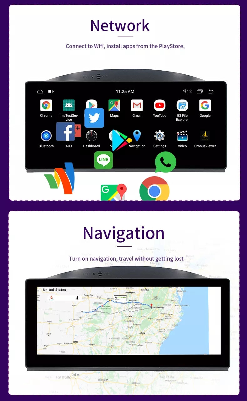 10.25 inch Android 11.0 HD digital touch screen 1. Android 11.0 operating system 2. Support 1080P+ support lossless music 3. Support steering wheel control (if your car has it) 4. Support Phone Link (AirPlay, Miracast) 5. Output: 4x50W max Power output/5.1 channel lossless audio output 6.Audio Frequency: 7 EQ balanced audio processing technology 7.OSD language: English/Russian/French/German/Spanish/Italian/Arabic/Portuguese/Turkish/Thai/ More than 20 languages such as Polish/Hebrew 8. Automatically display rear view camera image when reversing 9. Support media card/GPS card/USB memory stick up to 32GB SD card and 1T hard disk 10. Audio model: Classic/Rock/ Pop/Hall Cinema 11. Music spectrum: display music spectrum when playing audio 12. Audio format: MP3/ WMA/ FLAC/ APE/ ACC etc. 13. Picture format: JPG/ BMP/ GIF/ PNG etc. 14. Video format: H264/ MP4/ AVI/ RMVB/ FLV/ MKV/ MOV, etc. 15.WiFi: Built-in WiFi and antenna 16.Car Door Info: Display the status of the door switch (the original car has this function) 17.Rotating Speed: Display the speed on the screen 18. Running Speed: Display the running speed or engine on the screen 19. Rear view camera: For cars without original camera 20. Support the latest phonebook search, you can search and find contacts in the downloaded phonebook, just enter the name The first letter, you will find some related names, then you can choose the suitable one 21.Radio Tuner with RDS, 30 Preset Radio Stations (FM: 3*6, AM: 2*6) 22.USB port and Micro SD slot, support USB stick and memory card up to 32GB 23.Parking Sensor: Suitable for cars without original parking sensor 24.TPMS: USB TPMS for Android car GPS 25.Support steering wheel control function Support steering wheel control