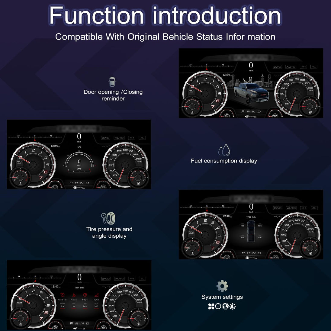 - 🚗Upgrade your Dodge Ram 2008-2012 with this Digital Speedometer and embrace the future of driving technology. We retained the original car instrument cable, No cutting or modification required, and installed in the new digital instrument screen, which can retain all the data and functions of the original car. so that our new digital instrument cluster can work more perfectly with the original car.