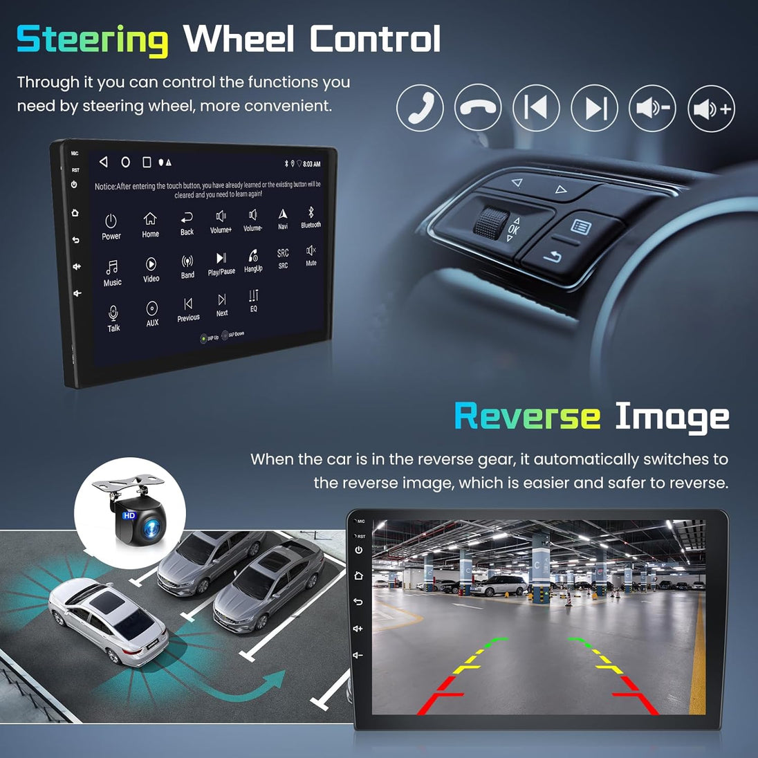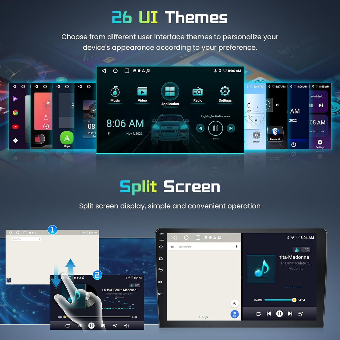 Características principales: Sistema operativo: Android10.0 Tamaño de visualización: visualización digital de alta definición de 9/10 pulgadas Resolución de visualización 1024*600 Memoria: 1GB+ 16GB/2GB+ 32GB/4GB+64GB 6+128G, 8+128G (opcional) Procesador: 4-core/8-core Potencia de salida: 4x50W Rango de frecuencia FM: 87.5-108 MHz, 18 radio radio stSe pueden preajustar navegación GPS: Google Maps Online... 9/10 pulgadas Android 11.0 HD visualización táctil digital 1. Sistema operativo Android 11.0. 2. Compatible con 1080P+ con música sin pérdidas. 3. Compatible con el control del volante (si tu coche lo tiene). 4. Compatible con enlace telefónico (AirPlay, Miracast) 5. Salida: 4 x 50 W máx. Potencia de salida/5.1 canales salida de audio sin pérdidas. Frecuencia de audio: 7 EQ tecnología de procesamiento de audio balanceada. 7. Idioma OSD: inglés/ruso/francés/alemán/español/italiano/árabe/portugués/turco/tailandés/más de 20 idiomas como polaco/hebreo 8. Muestra automáticamente la imagen de la cámara de visión trasera al invertir. 9. Compatible con tarjeta multimedia, tarjeta GPS, memoria USB de hasta 32 GB de tarjeta SD y disco duro 1 T. 10. Modelo de audio: Classic/Rock/ Pop/salón Cinema 11. Espectro musical: muestra el espectro musical al reproducir audio 12. Formato de audio: MP3, WMA, FLAC, APE, ACC, etc. 13. Formato de imagen: JPG, BMP, GIF, PNG, etc. 14. Formato de vídeo: H264/ MP4/ AVI/ RMVB/ FLV/MKV/MOV, etc. 15. WiFi: WiFi y antena integrados. 16. Información de la puerta del coche: muestra el estado del interruptor de la puerta (el coche original tiene esta función). 17. Velocidad de rotación: muestra la velocidad en la visualización. 18. Velocidad de funcionamiento: muestra la velocidad de funcionamiento o el motor en la visualización 19. Cámara de visión trasera: para coches sin cámara original 20. Soporta la última búsqueda de la agenda telefónica, puedes buscar y encontrar contactos en la agenda descargada, simplemente ingresa el nombre. La primera letra, encontrarás algunos nombres relacionados, luego puedes elegir el adecuado. 21. Sintonizador de radio con RDS, 30 estaciones de radio preestablecidas (FM: 3 x 6, AM: 2 x 6). 22. Puerto USB y ranura micro SD, compatible con memoria USB y tarjeta de memoria de hasta 32 GB 23.ParparparparSensor King: adecuado para coches sin sensor de estacionamiento original. 24. TPMS: USB TPMS para Android coche GPS 25. Compatible con función de control del volante. Compatible con función de control del volante