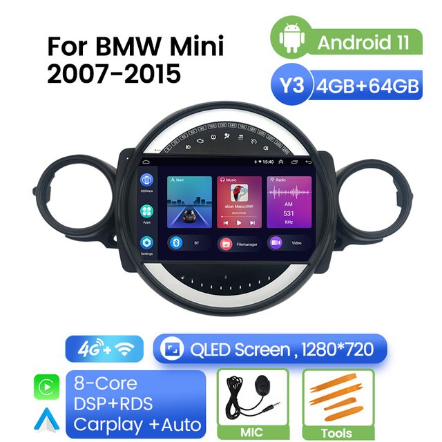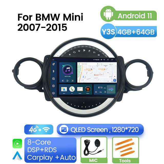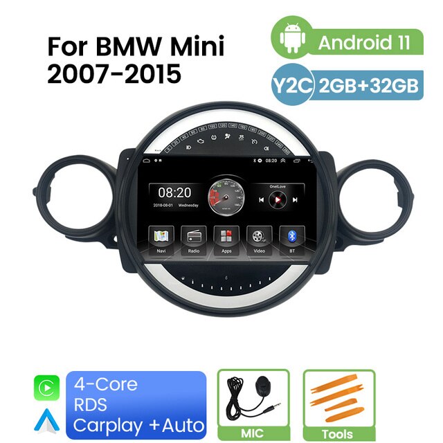 Omnitek Android 11 2.5D IPS QLED Screen Car Multimedia Radio Player for BMW Mini 2007 2008 - 2015 GPS Navigation Built-in Carplay Auto