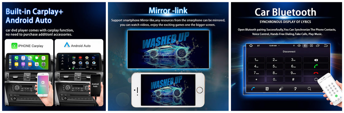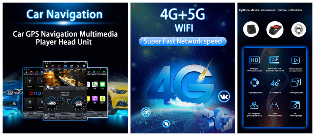 Main features: CPU chip: Quad core / Octa Core RAM+ROM : 1G+16G / 2G+32G /4+64GB / 6+128GB Android 11GO system Media format: AVI ASF MKV . FLV .RMVB WMV RM MP3 MP4 MOV MPEG VOB More formats support You can download other players in the Google Store. 9-inch 1280*720 high-definition digital display Pre-installed maps: Google online maps or other popular maps (About 1GB-6GB of system memory) Optional built-in1G DDR3 16Gflash/ 2G DDR3 32Gflash/ 4G DDR3 64Gflash Built-in WiFi module that supports WiFi connection to the Internet. Support for rear view camera input Integrated amplifier 4x45 W.4x50 W. Radio FM frequency range: 87.5-108 MHz Two rear USB input connectors It supports steering wheel control (or you can choose the Bluetooth steering wheel remote control) Rear video input/output 2 CH after RCA input 2-channel rear audio output 1 channel video output It supports smartphone connection, mirror link, dual control Full screen capacitive touch screen control Bluetooth 5.0 built-in, hands-free, phone book, music It supports A2DP Steam music playback from mobile to radio OSD language: English, Russian, German, French, Italian, Spanish, Arabic, Hebrew, Japanese, Czech, Portuguese, Romanian, Turkish, Korean Thai, Latvian, Spanish, Italian , Japanese, Chinese (Traditional), Romanian, Hungarian, Chinese (Simplified), Korean, Swedish, Ukrainian, Croatian, Danish, Norwegian, Finnish, Turkish, Filipino, Portuguese, Lithuanian, Poland, Slovakia, the Netherlands and Estonia.Approximately 60 languages are available! Input: DC 12V - 14.4V Support CMMB digital TV (optional) Support USB DVR (optional) Support TMPS (optional) Support OBD (optional) Support DAB + (optional) Package Included: 1 car Android GPS multimedia player 1 X rear camera (optional) 2 X USB cable 1 XGPS antenna 1 RCA cable 1XUser Manual10” HD TOUCH SCREEN UNIT: This car GPS player system features a touchscreen, multi color LCD display to make watching videos and listening to music more fun and convenient. This single din head unit receiver allows you to have full control over your car's music or visual entertainment. CARPLAY & ANDROID AUTO: This bluetooth car stereo compatible with Carplay and Android Auto. Simply connect the phone via USB cable. You can access map navigation, phone contacts, email, notification, music, video and more when driving. You can also use voice assistant for hands-free control and safer driving. Note: the car stereo mp5 player is not a GPS unit, it gets GPS navigation function by connecting to the phone. HANDS FREE OPERATION: This single din car radio features Bluetooth connectivity for wireless audio streaming. It also has hands free call answering ability along with a built in microphone to allow you to answer calls without taking your hands from the wheel. At the same time, 1din stereo also supports Bluetooth music, allowing you to listen to music and enjoy the driving process. REAR CAMERA SUPPORT: This touch screen car radio supports rear view camera so that you can easily control the vehicle when in reverse and has rear Aux input/output & integrated FM radio so you can access the latest news and traffic information. MULTIPLE CONNECTION TYPES: The in dash car deck console unit features various connection interfaces to allow you to link multimedia devices with ease. Features Aux input & rear panel Aux output connectors. Equipped with FM radio & TF SD Card input.