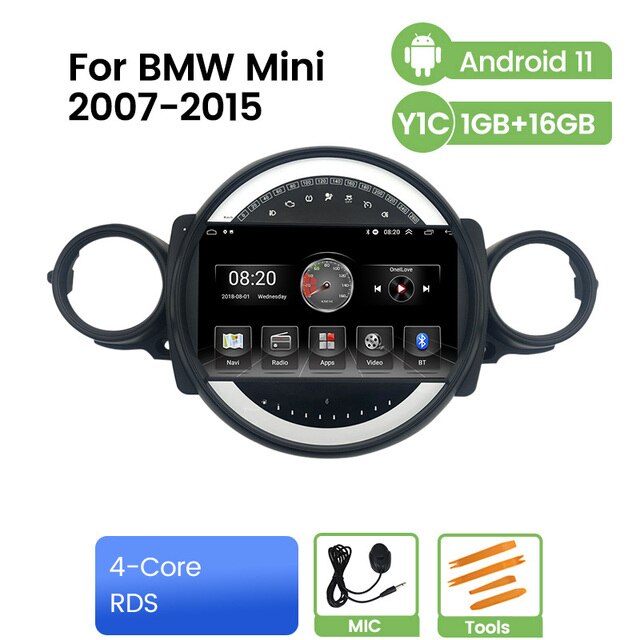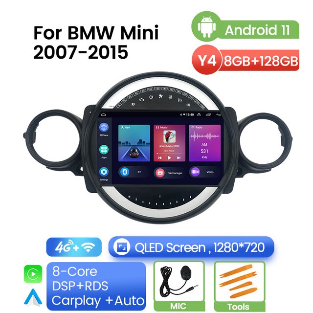 Omnitek Android 11 2.5D IPS QLED Screen Car Multimedia Radio Player for BMW Mini 2007 2008 - 2015 GPS Navigation Built-in Carplay Auto