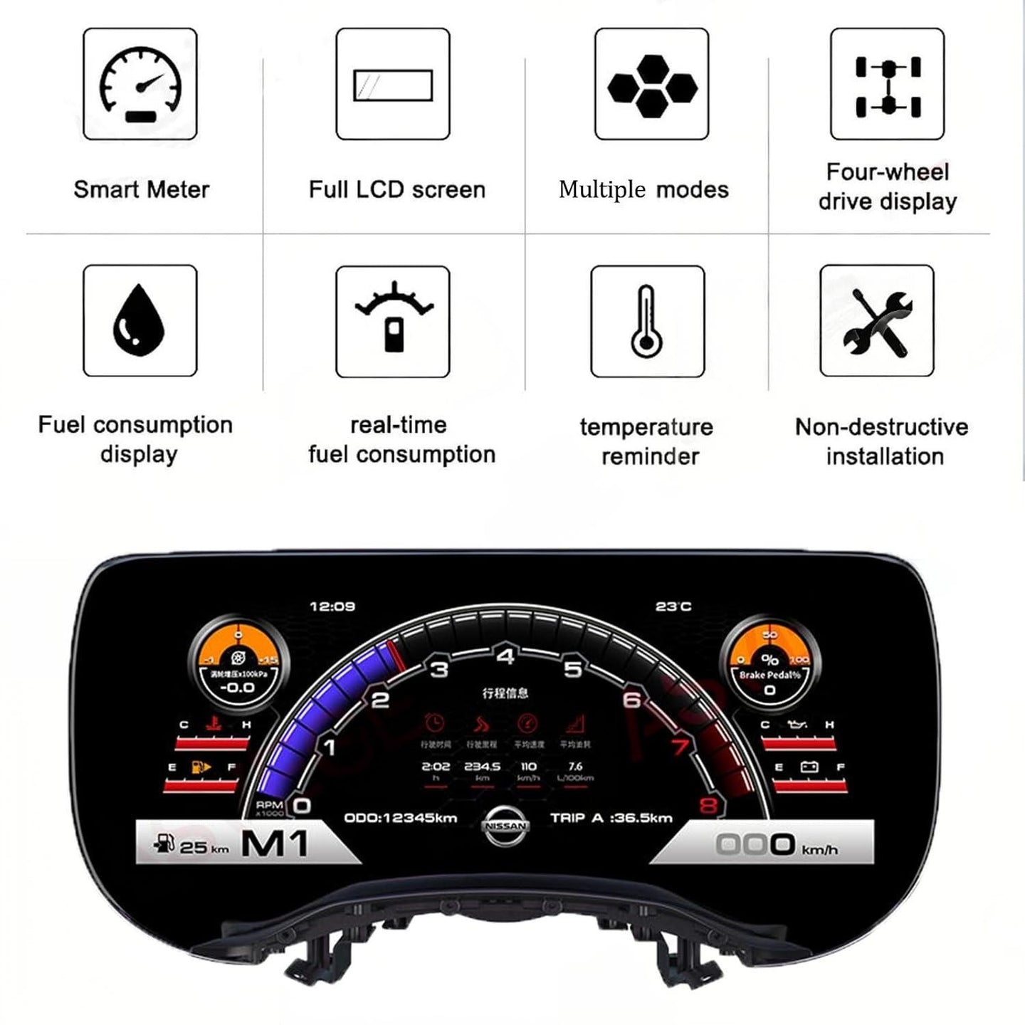 Display the car’s speed, fault lights, indicator lights, ACC, TMC, Gas, Radio, etc.…