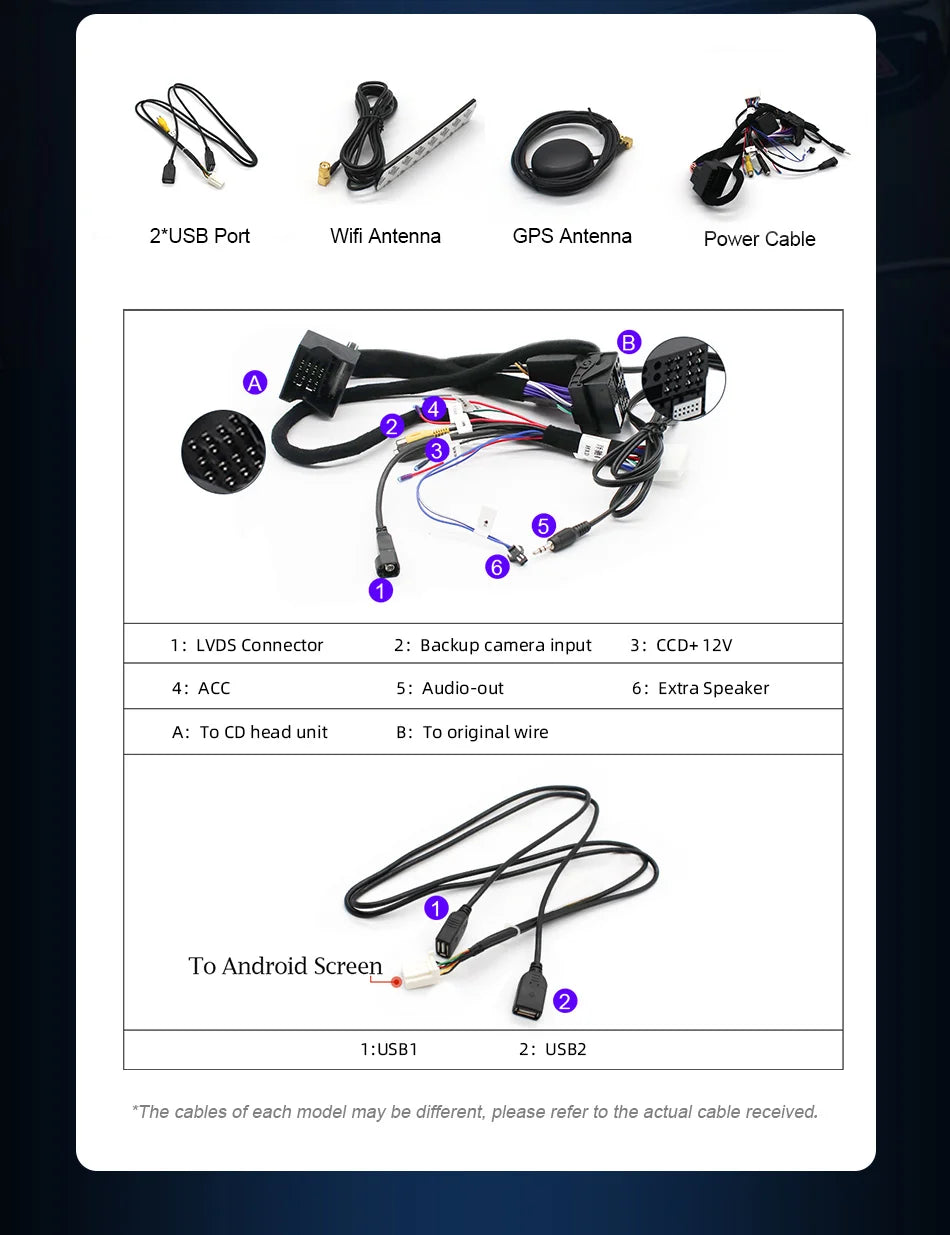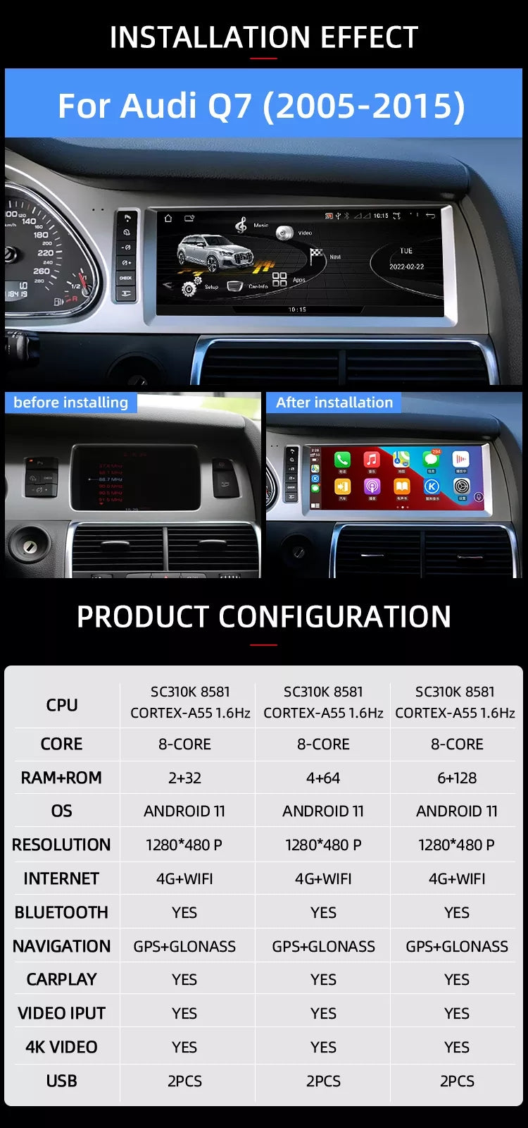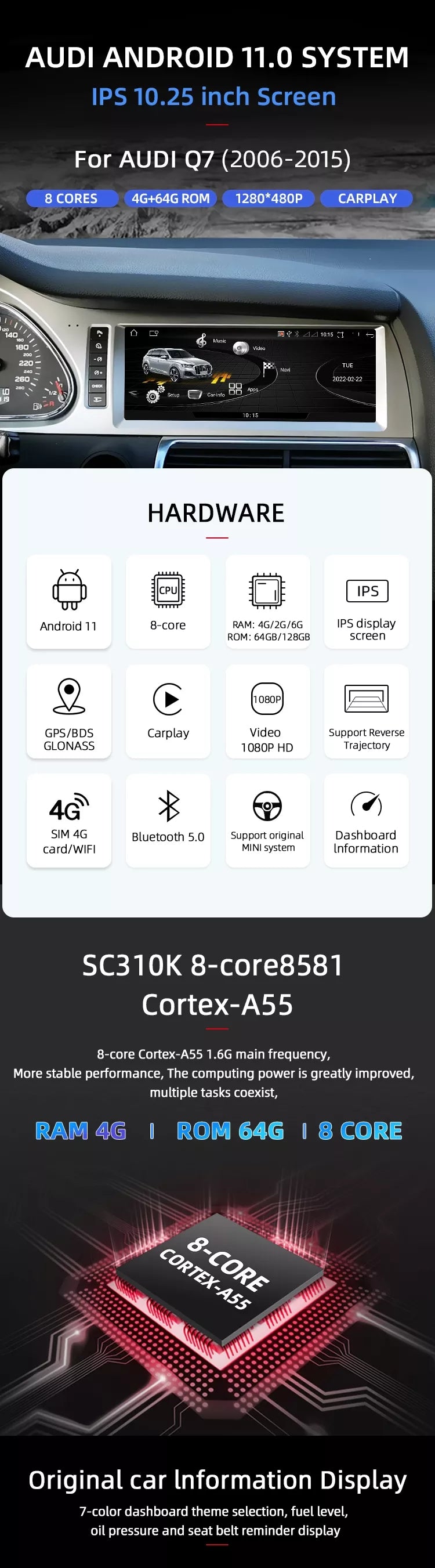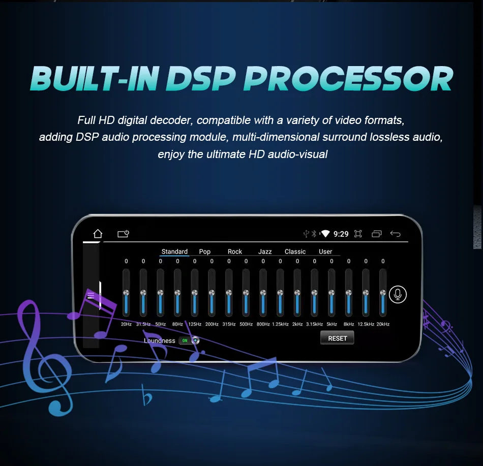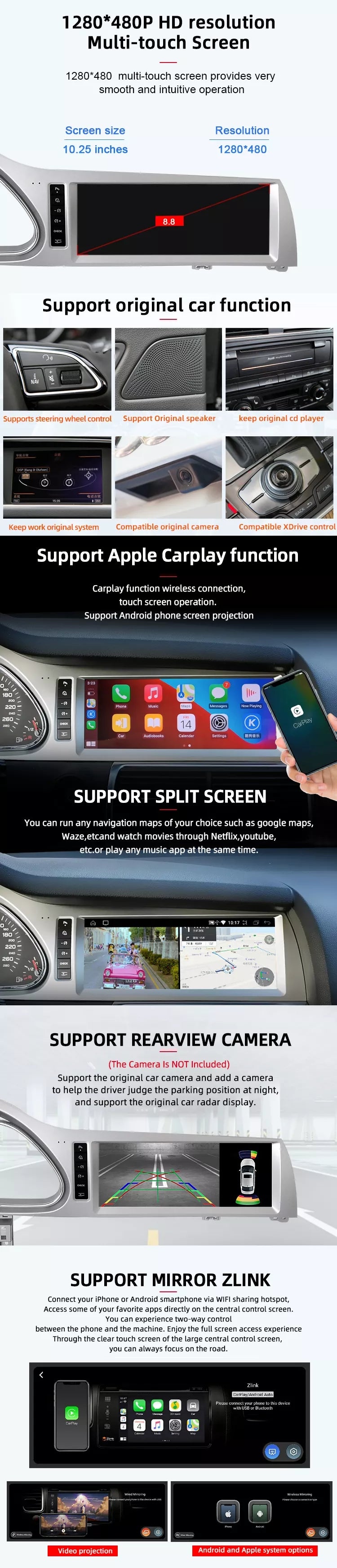 9/10 inch Android 11.0 HD digital touch screen 1. Android 11.0 operating system 2. Support 1080P+ support lossless music 3. Support steering wheel control (if your car has it) 4. Support Phone Link (AirPlay, Miracast) 5. Output: 4x50W max Power output/5.1 channel lossless audio output 6.Audio Frequency: 7 EQ balanced audio processing technology 7.OSD language: English/Russian/French/German/Spanish/Italian/Arabic/Portuguese/Turkish/Thai/ More than 20 languages such as Polish/Hebrew 8. Automatically display rear view camera image when reversing 9. Support media card/GPS card/USB memory stick up to 32GB SD card and 1T hard disk 10. Audio model: Classic/Rock/ Pop/Hall Cinema 11. Music spectrum: display music spectrum when playing audio 12. Audio format: MP3/ WMA/ FLAC/ APE/ ACC etc. 13. Picture format: JPG/ BMP/ GIF/ PNG etc. 14. Video format: H264/ MP4/ AVI/ RMVB/ FLV/ MKV/ MOV, etc. 15.WiFi: Built-in WiFi and antenna 16.Car Door Info: Display the status of the door switch (the original car has this function) 17.Rotating Speed: Display the speed on the screen 18. Running Speed: Display the running speed or engine on the screen 19. Rear view camera: For cars without original camera 20. Support the latest phonebook search, you can search and find contacts in the downloaded phonebook, just enter the name The first letter, you will find some related names, then you can choose the suitable one 21.Radio Tuner with RDS, 30 Preset Radio Stations (FM: 3*6, AM: 2*6) 22.USB port and Micro SD slot, support USB stick and memory card up to 32GB 23.Parking Sensor: Suitable for cars without original parking sensor 24.TPMS: USB TPMS for Android car GPS 25.Support steering wheel control function Support steering wheel control function