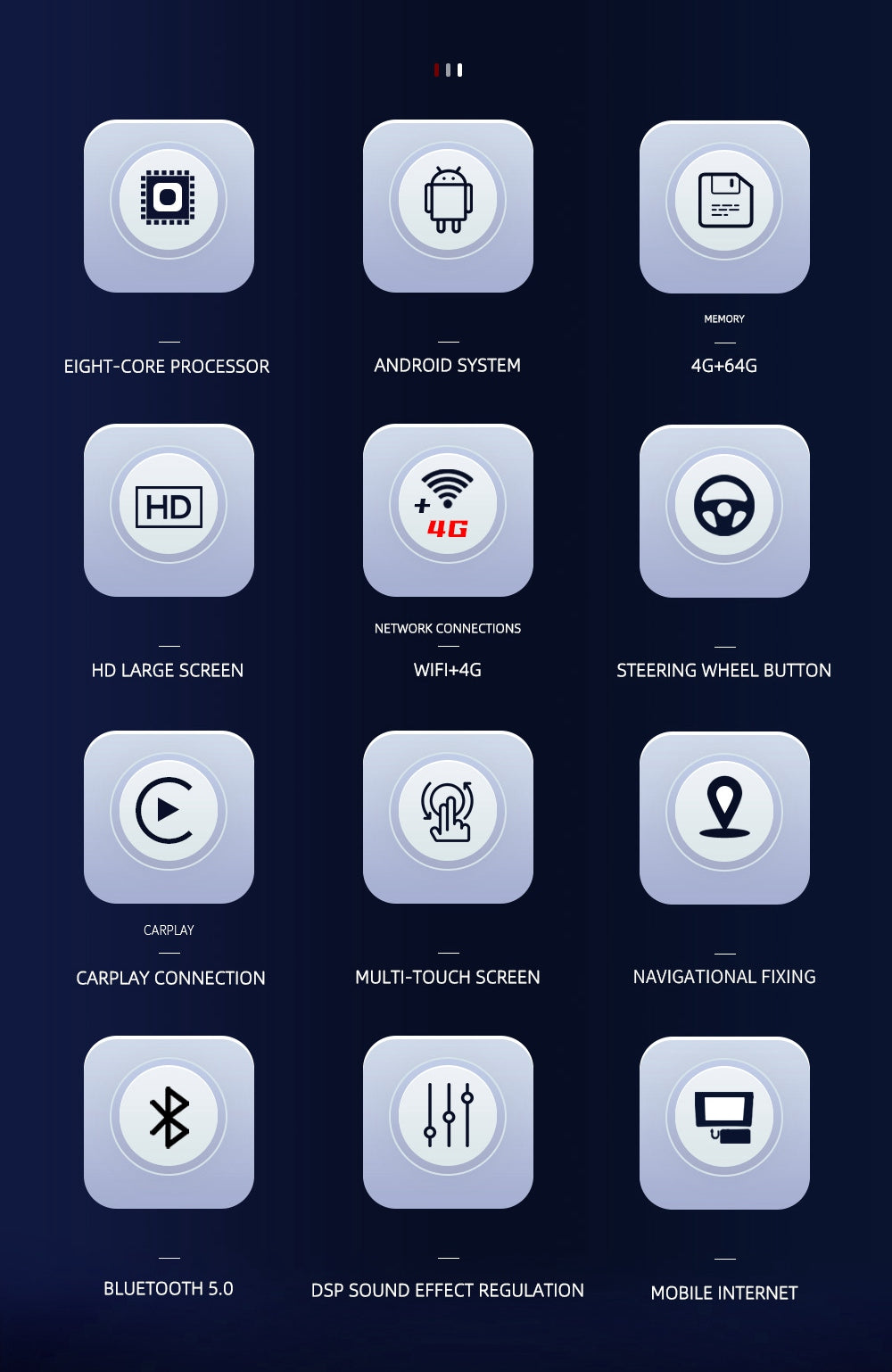 13.3 inch Android 11.0 HD digital touch screen 1. Android 11.0 operating system 2. Support 1080P+ support lossless music 3. Support steering wheel control (if your car has it) 4. Support Phone Link (AirPlay, Miracast) 5. Output: 4x50W max Power output/5.1 channel lossless audio output 6.Audio Frequency: 7 EQ balanced audio processing technology 7.OSD language: English/Russian/French/German/Spanish/Italian/Arabic/Portuguese/Turkish/Thai/ More than 20 languages such as Polish/Hebrew 8. Automatically display rear view camera image when reversing 9. Support media card/GPS card/USB memory stick up to 32GB SD card and 1T hard disk 10. Audio model: Classic/Rock/ Pop/Hall Cinema 11. Music spectrum: display music spectrum when playing audio 12. Audio format: MP3/ WMA/ FLAC/ APE/ ACC etc. 13. Picture format: JPG/ BMP/ GIF/ PNG etc. 14. Video format: H264/ MP4/ AVI/ RMVB/ FLV/ MKV/ MOV, etc. 15.WiFi: Built-in WiFi and antenna 16.Car Door Info: Display the status of the door switch (the original car has this function) 17.Rotating Speed: Display the speed on the screen 18. Running Speed: Display the running speed or engine on the screen 19. Rear view camera: For cars without original camera 20. Support the latest phone book search, you can search and find contacts in the downloaded phone book, just enter the name The first letter, you will find some related names, then you can choose the suitable one 21.Radio Tuner with RDS, 30 Preset Radio Stations (FM: 3*6, AM: 2*6) 22.USB port and Micro SD slot, support USB stick and memory card up to 32GB 23.Parking Sensor: Suitable for cars without original parking sensor 24.TPMS: USB TPMS for Android car GPS 25.Support steering wheel control function Support steering wheel control function