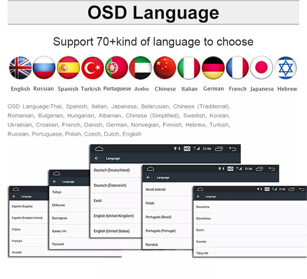 8.OSD Language: English / Russian / French /German / Spanish / Italian / Arabic / Portuguese /Turkish / Thai / Polish / Hebrew all 53 languages