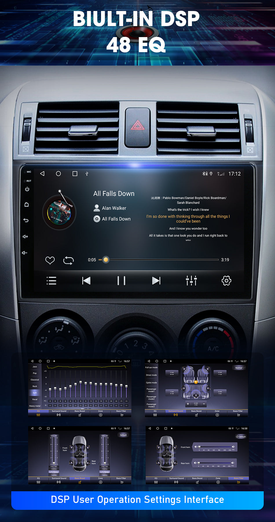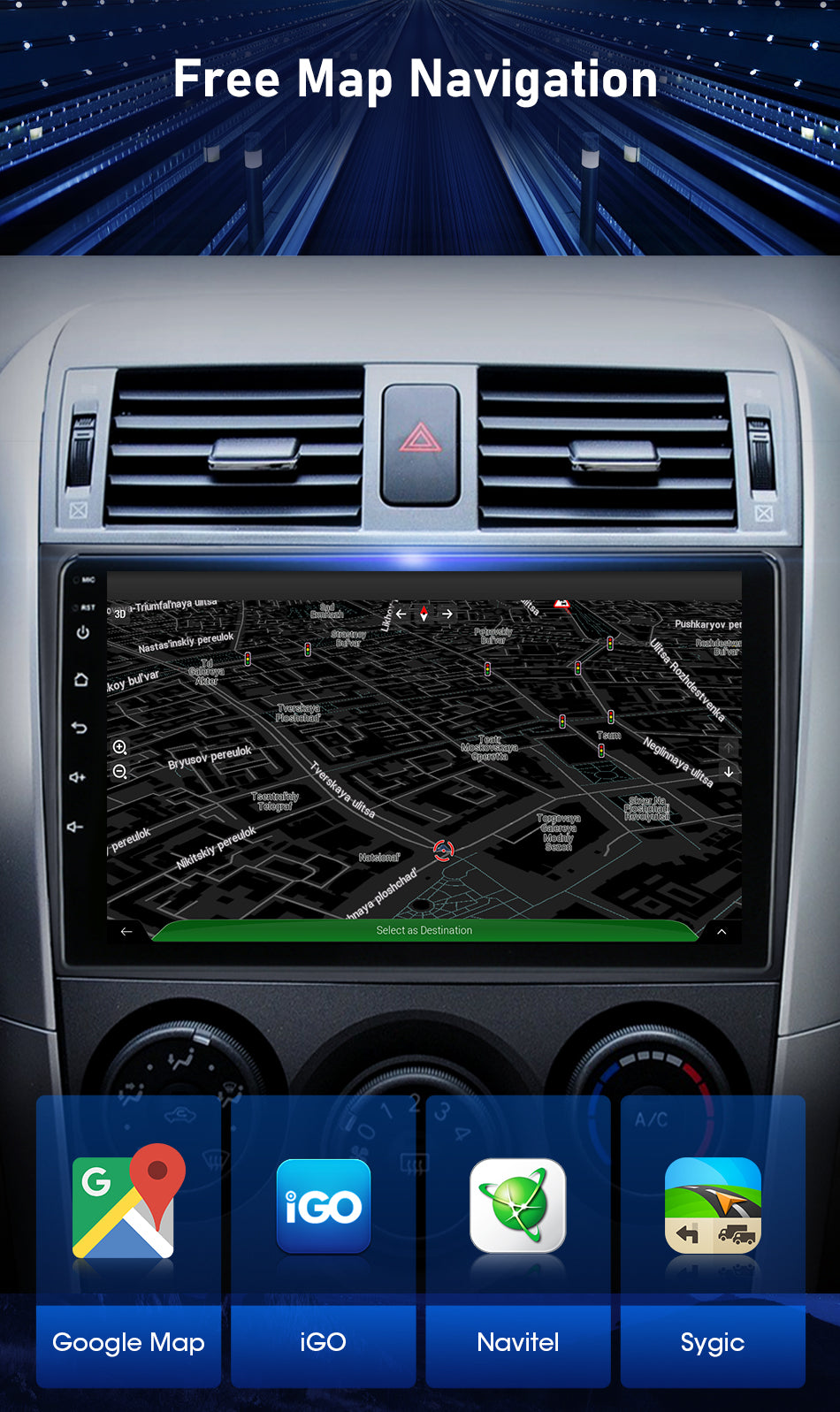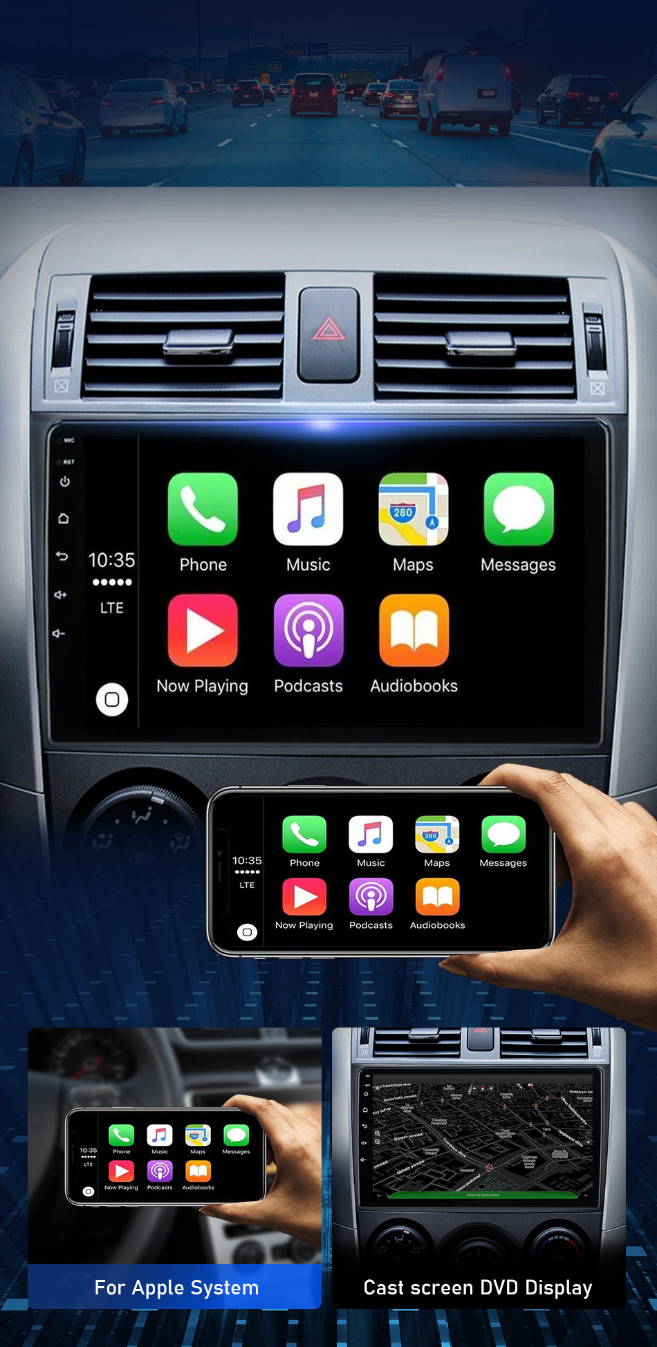 9/10 inch Android 11.0 HD digital touch screen 1. Android 11.0 operating system 2. Support 1080P+ support lossless music 3. Support steering wheel control (if your car has it) 4. Support Phone Link (AirPlay, Miracast) 5. Output: 4x50W max Power output/5.1 channel lossless audio output 6.Audio Frequency: 7 EQ balanced audio processing technology 7.OSD language: English/Russian/French/German/Spanish/Italian/Arabic/Portuguese/Turkish/Thai/ More than 20 languages such as Polish/Hebrew 8. Automatically display rear view camera image when reversing 9. Support media card/GPS card/USB memory stick up to 32GB SD card and 1T hard disk 10. Audio model: Classic/Rock/ Pop/Hall Cinema 11. Music spectrum: display music spectrum when playing audio 12. Audio format: MP3/ WMA/ FLAC/ APE/ ACC etc. 13. Picture format: JPG/ BMP/ GIF/ PNG etc. 14. Video format: H264/ MP4/ AVI/ RMVB/ FLV/ MKV/ MOV, etc. 15.WiFi: Built-in WiFi and antenna 16.Car Door Info: Display the status of the door switch (the original car has this function) 17.Rotating Speed: Display the speed on the screen 18. Running Speed: Display the running speed or engine on the screen 19. Rear view camera: For cars without original camera 20. Support the latest phonebook search, you can search and find contacts in the downloaded phonebook, just enter the name The first letter, you will find some related names, then you can choose the suitable one 21.Radio Tuner with RDS, 30 Preset Radio Stations (FM: 3*6, AM: 2*6) 22.USB port and Micro SD slot, support USB stick and memory card up to 32GB 23.Parking Sensor: Suitable for cars without original parking sensor 24.TPMS: USB TPMS for Android car GPS 25.Support steering wheel control function Support steering wheel control function
