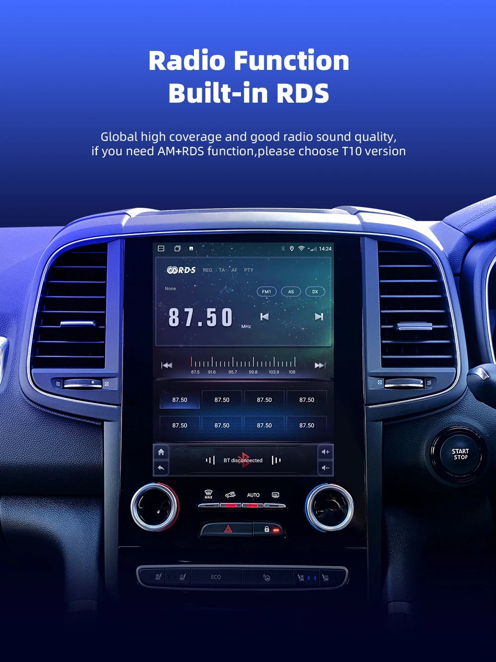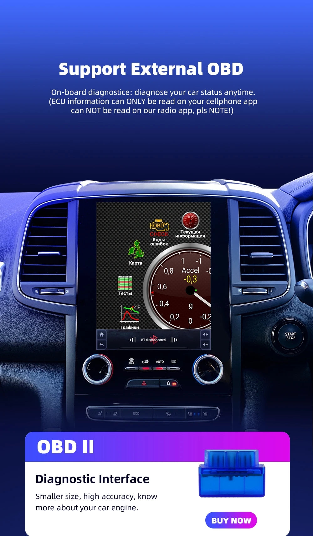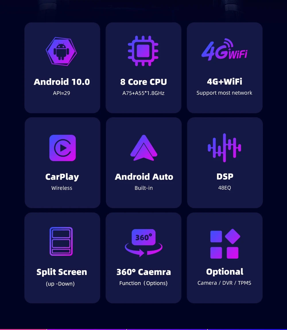 10.4 inch Android 11.0 HD digital touch screen 1. Android 11.0 operating system 2. Support 1080P+ support lossless music 3. Support steering wheel control (if your car has it) 4. Omnitek 9 Inches Android GPS navigation car stereo Support Phone Link (AirPlay, Miracast) 5. Omnitek 9 Inches Android GPS navigation car stereo Output: 4x50W max Power output/5.1 channel lossless audio output 6.Audio Frequency: 7 EQ balanced audio processing technology 7.OSD language: English/Russian/French/German/Spanish/Italian/Arabic/Portuguese/Turkish/Thai/ More than 20 languages such as Polish/Hebrew 8. Automatically display rear view camera image when reversing 9. Support media card/GPS card/USB memory stick up to 32GB SD card and 1T hard disk 10. Audio model: Classic/Rock/ Pop/Hall Cinema 11. Music spectrum: display music spectrum when playing audio 12. Audio format: MP3/ WMA/ FLAC/ APE/ ACC etc. 13. Picture format: JPG/ BMP/ GIF/ PNG etc. 14. Video format: H264/ MP4/ AVI/ RMVB/ FLV/ MKV/ MOV, etc. 15.WiFi: Built-in WiFi and antenna 16.Car Door Info: Display the status of the door switch (the original car has this function) 17.Rotating Speed: Display the speed on the screen 18. Running Speed: Display the running speed or engine on the screen 19. Rear view camera: For cars without original camera 20. Omnitek 9 Inches Android GPS navigation car stereo Support the latest phonebook search, you can search and find contacts in the downloaded phonebook, just enter the name The first letter, you will find some related names, then you can choose the suitable one 21.Radio Tuner with RDS, 30 Preset Radio Stations (FM: 3*6, AM: 2*6) 22.USB port and Micro SD slot, support USB stick and memory card up to 32GB 23.Parking Sensor: Suitable for cars without original parking sensor 24.TPMS: USB TPMS for Android car GPS 25.Support steering wheel control function Support steering wheel control function Omnitek 9 Inches Android GPS navigation car stereo